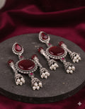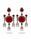 Antique Silver-Plated Red Stone Jhumka Earrings with Pearl Droplets