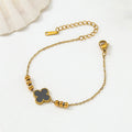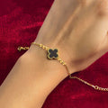 Add a touch of elegance and modern simplicity to your jewelry collection with this Gold Clover Charm Bracelet. Featuring a sleek black enamel clover centerpiece framed with delicate beaded detailing, this piece beautifully balances minimalism with luxury. The bracelet is accented with polished gold beads on each side and paired with a fine gold chain for a refined, timeless look.