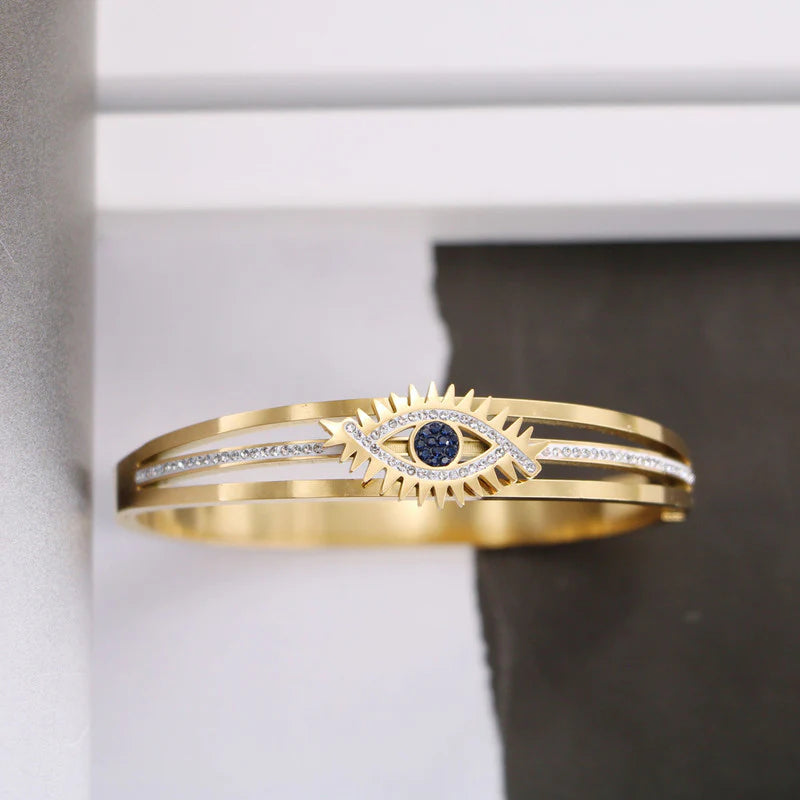 Stainless Steel Gold Plated American Diamond Studded Evil Eye Anti-Tarnish Bracelet