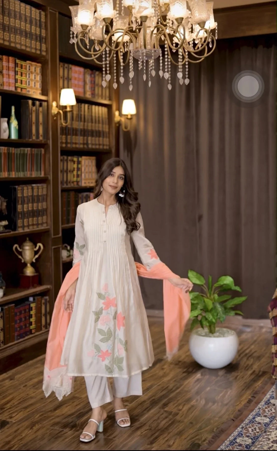Embrace subtle elegance with this ivory floral embroidered kurta set, thoughtfully designed for women who...