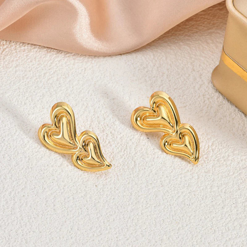 Anti-Tarnish Gold Double Heart Stud Earring
