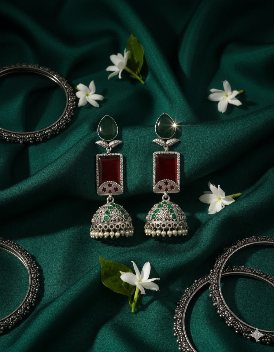 Make a stunning style statement with these beautifully crafted jhumka earrings, designed with a rich blend of deep green teardrop stones and bold red rectangular panels. The antique silver finish adds a timeless charm, while the dome-shaped jhumkas feature intricate floral carvings and vibrant green accents that shine brilliantly. Delicate pearl-like bead danglers create graceful movement, making these earrings perfect for festive occasions, weddings, and traditional celebrations. Lightweight yet striking, they effortlessly elevate sarees, lehengas, and ethnic fusion outfits.