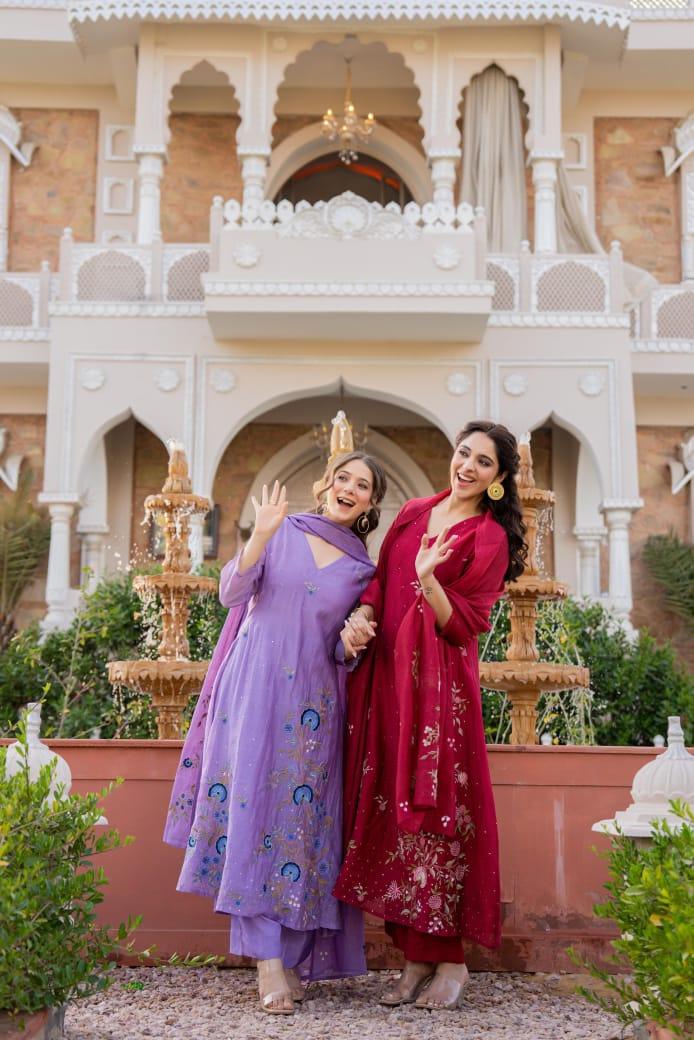 Make a graceful statement with this wine red embroidered kurta pant set, designed for elegant festive dressing. The kurta features delicate floral embroidery highlighted with subtle detailing that adds richness without overwhelming the look. Crafted in a flowy silhouette, it pairs beautifully with matching straight-fit pants and a soft, coordinated dupatta for a refined ethnic ensemble.
